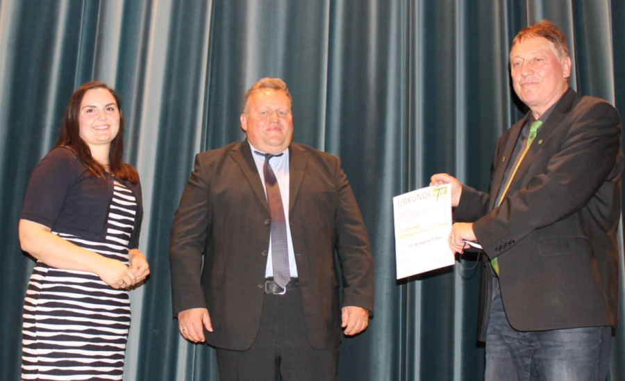 Dr. Wolfgang Eißen nimmt Ehrungsurkunde und goldene Ehrennadel entgegen von Stefan Käppeler und Daniela Katz-Raible entgegen.