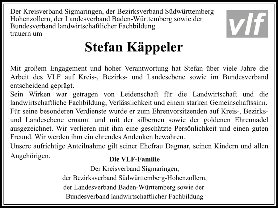 Als äußeres Zeichen unseres Dankes und unserer Anerkennung legen wir Dir lieber Stefan ein Kranzgebinde an Deinem Grabe nieder. Vorstand und Geschäftsführung des Bezirksverbandes, des Landesverbandes und des Bundesverbandes für landwirtschaftliche Fachbildung und all seine Mitglieder werden Stefan Käppeler steht’s in würdiger Erinnerung bewahren.